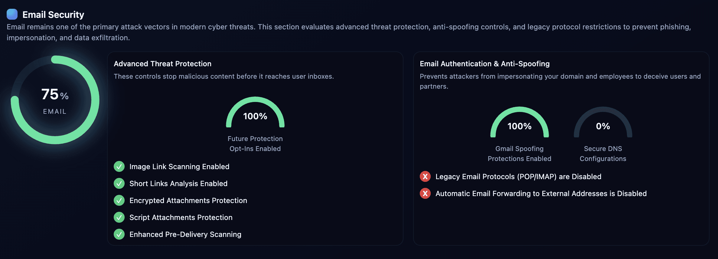 Assess advanced email threat protections and delivery controls to prevent phishing, malicious links, and weaponized attachments before they reach user inboxes.